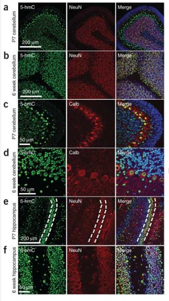 5-hydroxymethylcytosines (5-hmC) went undiscovered because they showed up like other 5-methoxycytosines through bisulfide sequencing. The neuroscientists behind a new study in Nature Neuroscience profiles 5-hmC across development using T4 bacteriophage B-glucosyltransferase to transfer an engineered glucose-azide moiety onto the the hydroxyl of 5-hmC. This moiety was then detected and used to map 5-hmCs across the genome of mouse cerebellar and hippocampal cells.